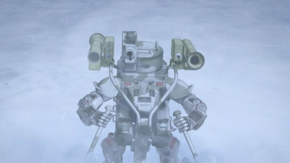 机甲滑雪一战惊心动魄,战斗结果则是宫岛机一比三完胜。敌方三机甲首要目的显然是逃亡,被追近后才依次投入战斗并无配合。先以反坦克导弹开火其实是昏招,这种有线制导导弹静(射手)打静(目标)能取得很高的命中率;静打动,如射手训练水平高也还可以;但动打动,还是对这种体积小于坦克装甲车、速度更快的机甲目标,则闻所未闻,绝无命中可能。后一台机甲在下滑撤退过程中回身以机枪塔向逼近的宫岛射击,其实非常吃亏:一方面倒退滑雪能滑好就不错了还要兼顾仰射,难度实在太大;另一方面从动画片中也能看到,被追击者滑雪产生的雪雾会遮蔽追击者,很多时候是盲目射击,而宫岛则可以自由选择何时隐蔽,何时冲出开火。最后一台机甲是被宫岛以亡命跃起撞击态势拉倒的,双方同时倒地后很快雪崩来袭,其实不应算战绩。