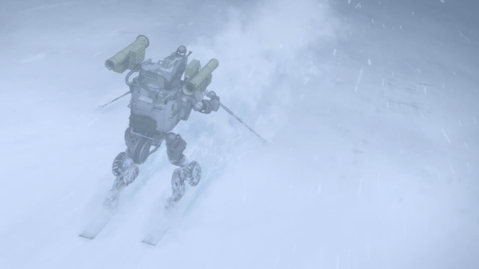 在山脊上成纵队行进的印军机甲小队,四台机甲以登山索相连。因暴风雪导致能见度超低,每台机甲的两个灯都开着。座舱左侧固定了滑雪板,射击孔处露出枪管。