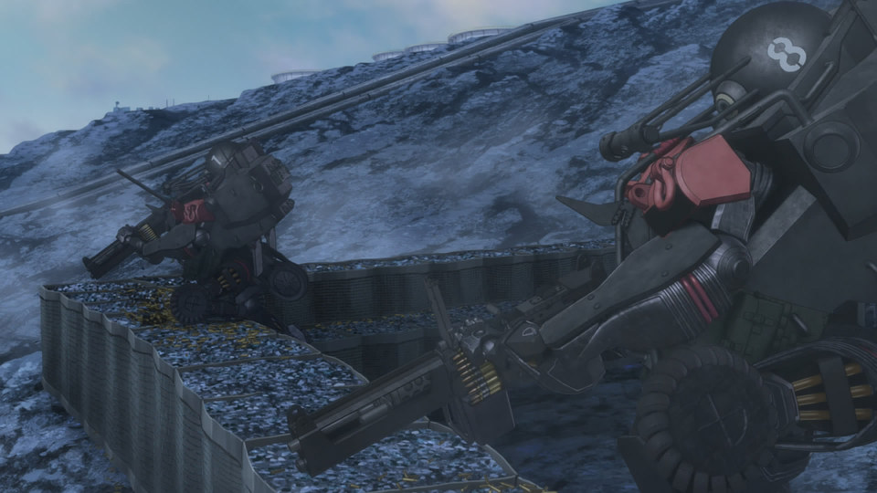 在这一集里放逐者旅大显神威,用纯熟的围点打援战法,对龟缩在阵地上的秘鲁军部队进行了火力压制,随后全灭了秘鲁军由两架载空降兵的直升机和至少7台机甲组成的增援部队。在时间顺序上我认为本集故事应早于EP01(虽然官网的时间线是EP01在前),因秘鲁军在此战中被打垮,才引来后续美帝暗中干预,这样的剧情安排感觉更合理一些。