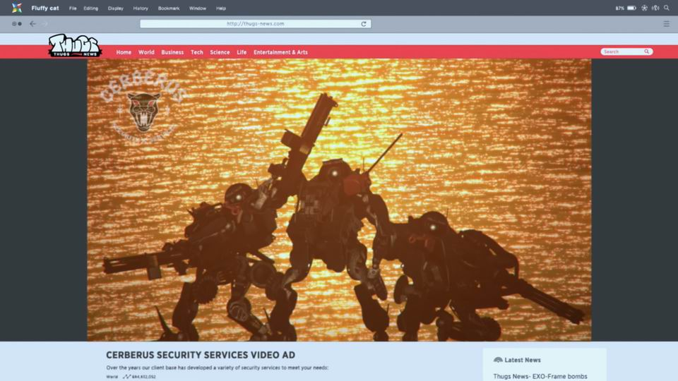 Bowman举着望远镜在辛苦执勤,连长大人却心不在焉地拿手机刷着新闻,这荒郊野外的上网信号还不错嘛,是不是用的华为的5G网络啊(安哥拉确实是华为在非洲的重要市场)?手机屏幕上有杜撰的THUGS NEWS(暴徒新闻)网站标志,下面有游商飞碟的照片,非洲国家应用EXO机甲做为农用拖拉机、石油公司秘密使用EXO机甲、呼吁印巴以对话和谈判化解冲突的新闻。