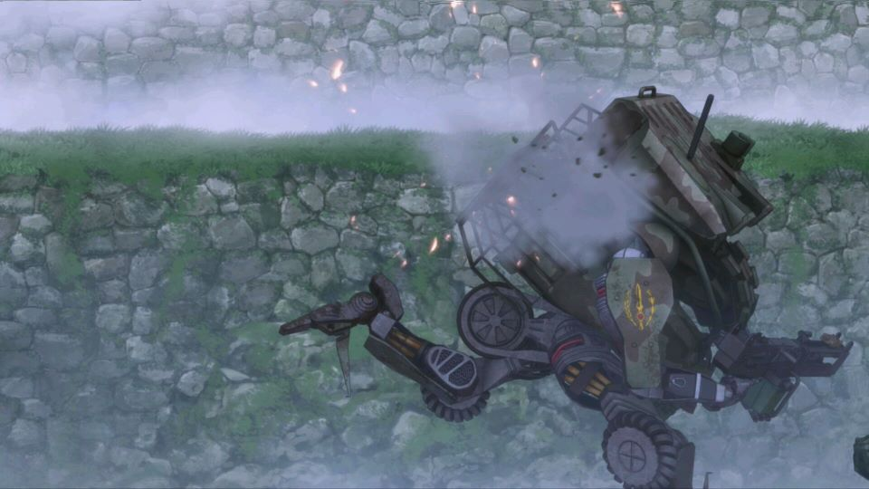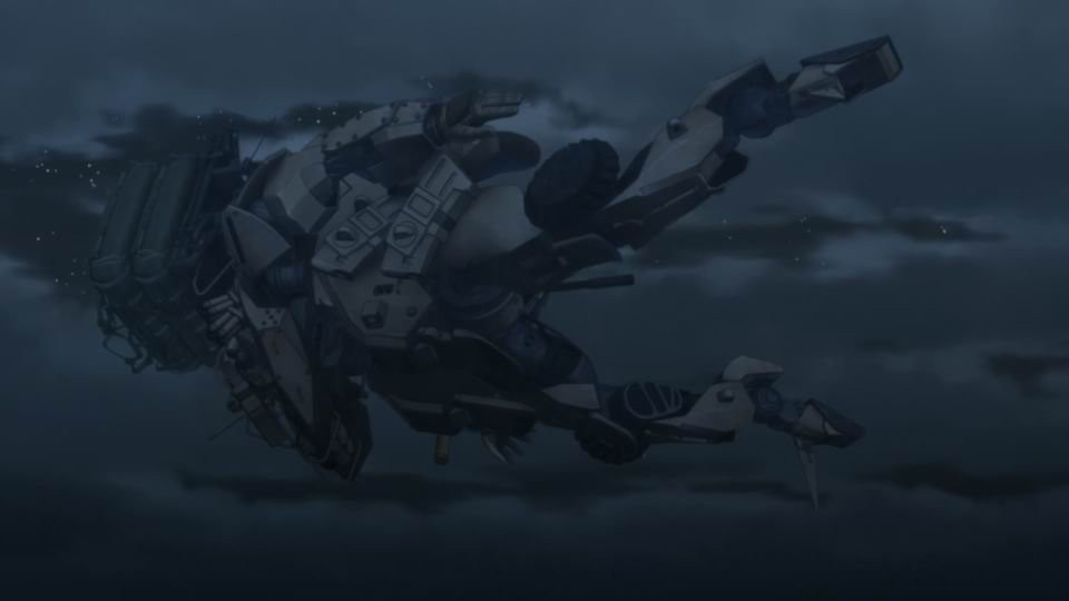 敌机甲机枪塔中弹,注意机甲两臂均举起,有一个类似护头的动作。这个很有意思,因为显然机甲并没有头,遭射击的情况下要保护的其实应该是后背乘员所在的位置。这个动作应是乘坐者出于本能做出的,而机甲则不加判断地忠实再现了这个动作。