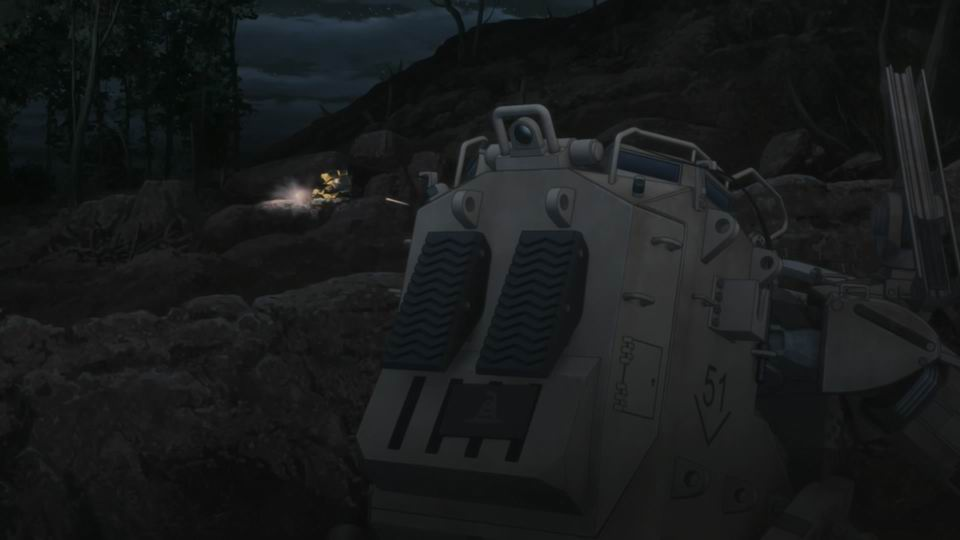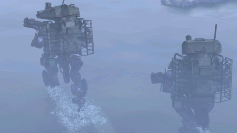 从迷雾中现身的放逐者旅战斗机甲,这支部队一直在用120毫米重型迫击炮压制远方秘鲁军阵地,也是秘鲁援军机甲想追上的目标。从之后的俯视镜头来看,这股部队中有四台机甲携带着迫击炮,每门炮还需另一台机甲配合,再加上两台护卫机甲,一共十台,和之前秘鲁军人根据足迹推断的数量一致。