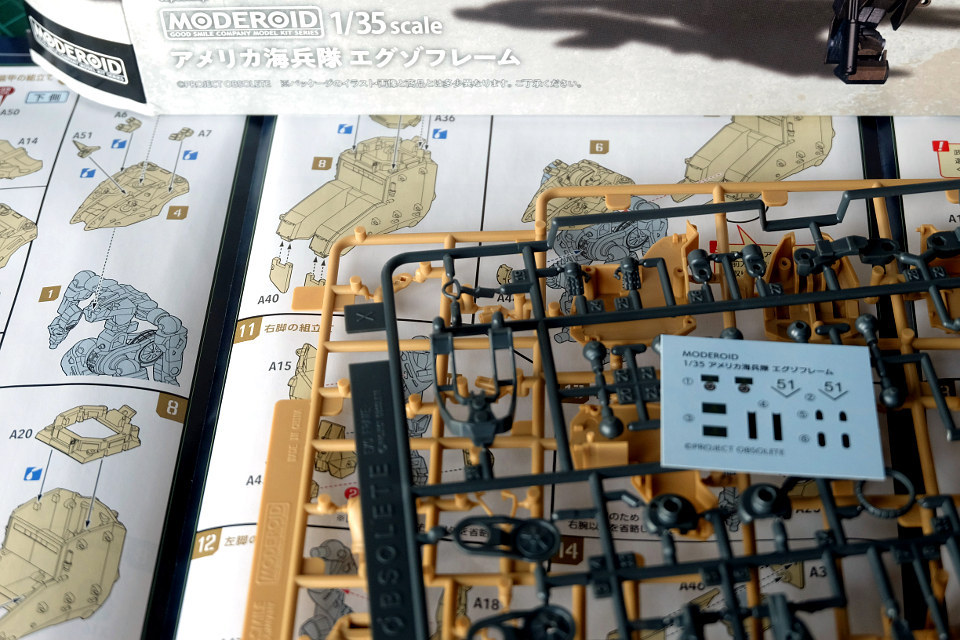 呈跪姿的EXO机甲,膝关节的两个轮子及足尖处着地,还能看到机甲屁股下那个轮子,应该是处于悬空状态。前胸装甲处的灯具电线由装甲穿孔引出。