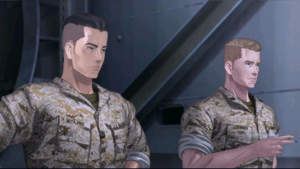 在航母上的宫岛黎和Leowner,看佩章宫岛黎是少尉,Leowner是三级军士长(Gunnery sergeant)。