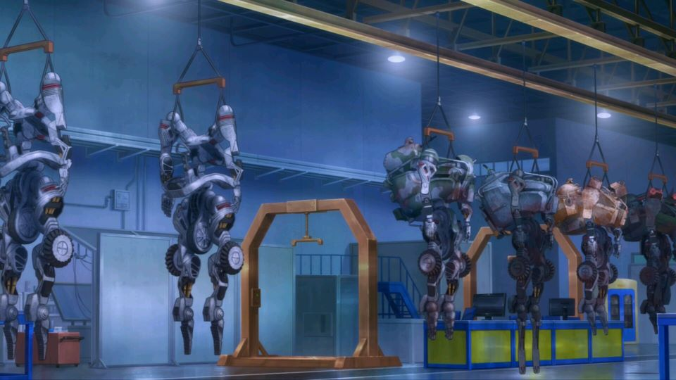 EXO机甲整备库内部,狭长的空间内机甲沿一侧放置,对面有收纳零件和设备的柜子,房顶有通长轨道和桥式吊车,两侧有高台。