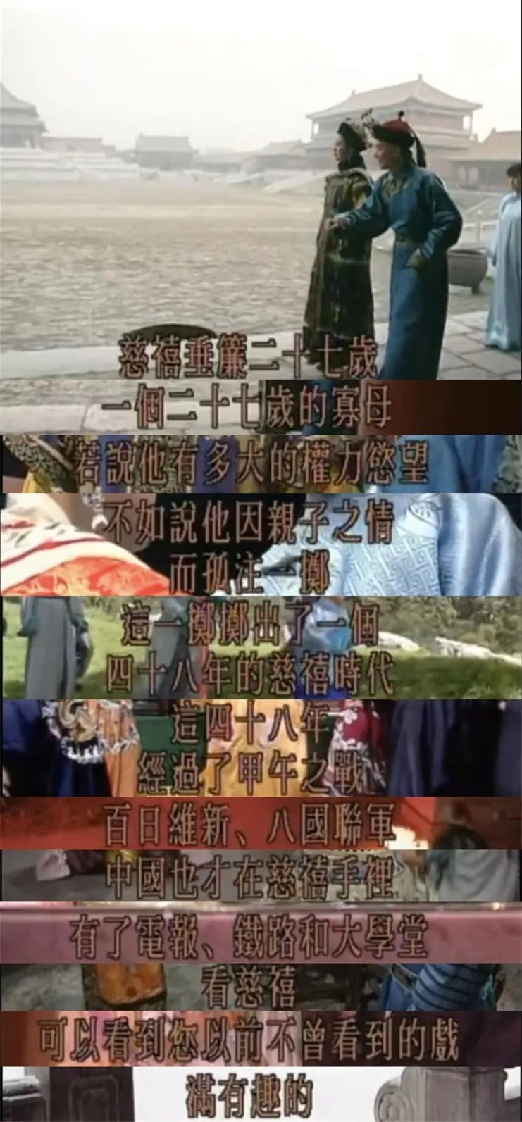 t而戏说系列,后续还拍了《戏说慈禧》《江湖奇侠传》,皆取材清朝,与《戏说乾隆》不同的是,主体为史说,亦多取稗官野史。《江湖奇侠传》我未看过。此番重温《戏说慈禧》,品这“戏说”,更像是史料中夹带“私货”,正史的部分比正剧正,野史的地方也大胆的“野”。“戏说”二字就妙在,慈禧作为女性,不能如乾隆般微服出宫,无法杜撰民间故事,于是不得不从了历史的走向,却在人物上大开大阔,由我“戏”说。