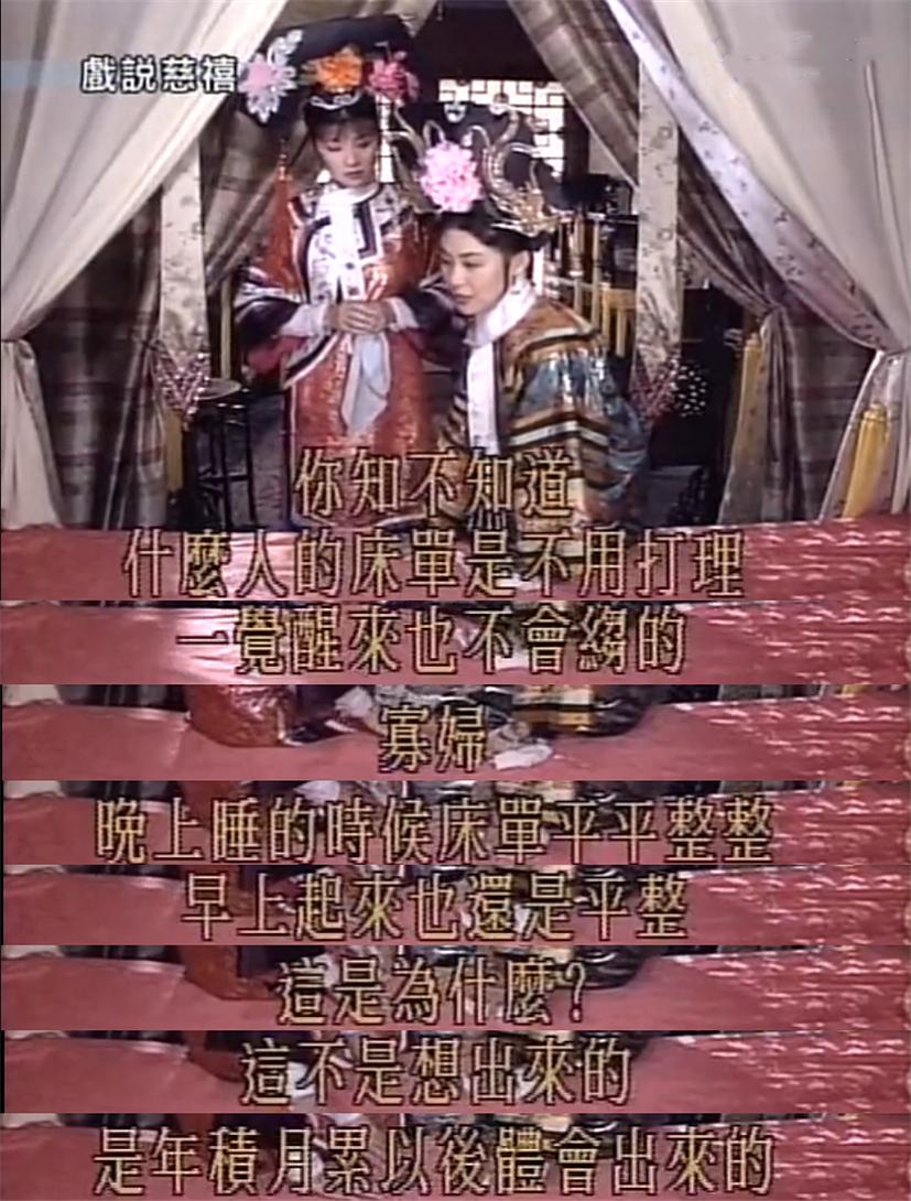 例如:守寡刚刚一年的慈禧和进宫来探望自己的妹妹坐在床沿上聊贴心话,并告诉妹妹只有寡妇的床单才是不用整理的。