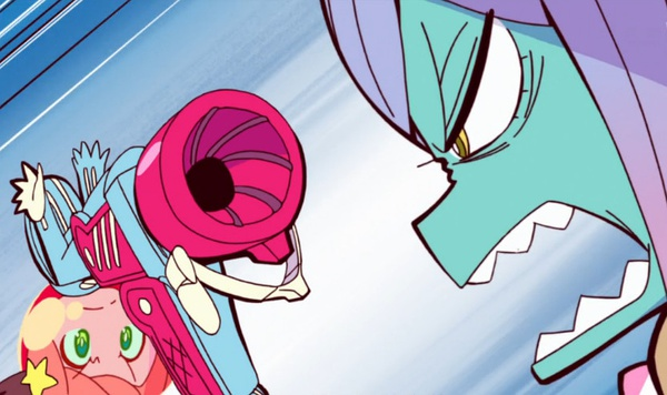 说到各自中意的角色时,今石说自己喜欢的角色除了露露子之外还有3话登场的绿,至于原因不便明说。雨宫则表示比较偏爱本部长Over Justice。他受访时穿着的T恤上印着的刻在本部长桌上的徽章图案便是最好的佐证。当被问为什么是本部长时,雨宫反问道:难道热爱正义还用得着找理由么。说到这位本部长Justice,除了专门请到小山茂人担纲设计外,就连他脑门上的紫色火焰都是由《小魔女学园》的监督吉成曜负责特效。一个配角同时动用两位重量级人物不可谓不奢侈,只不过吉成并不清楚那团火焰的实际用途。本部长的声优岩田光央也得到主创团队一致认可,据说他的配音被公认为是日本声优界最具正义感的声音。