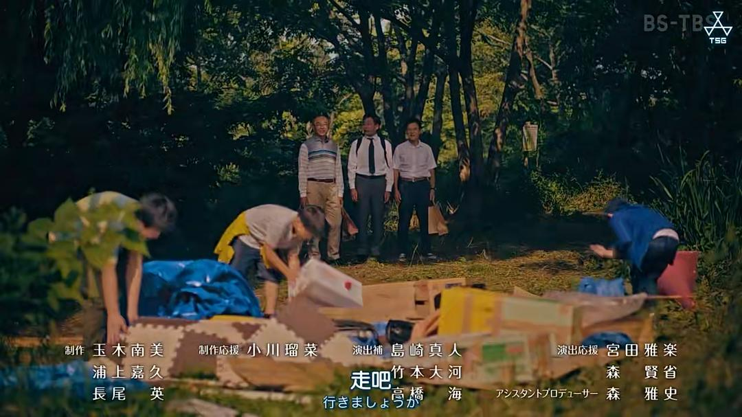嘿嘿,这集构思还挺巧妙的,来了个小小的插叙,开场先给你看一个绿林丛中纸箱和彩色帆布搭建出来的小帐篷。随后,再告诉你一周之前,三位大叔无意中在小树林里发现一块隐秘的空地,于是奇思妙想的他们决定利用纸板箱、儿童地垫搭建出一片属于他们的私密空间。