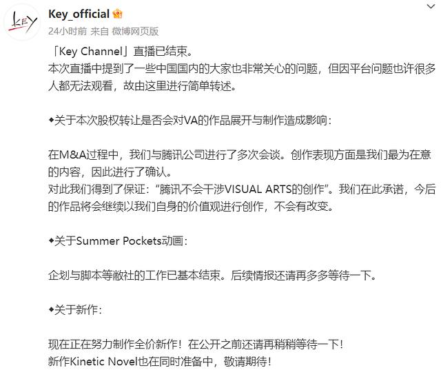 前段时间腾讯投资key后,很多人都在担忧,主要的原因是会干预游戏制作。我们这边的宝宝都知道,审核连自己的体系都没有,自然有这样的担心也正常,但昨天Key社的wb就直接说:“腾讯不会干涉VISUAL ARTS的创作”。