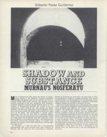 茂瑙与埃米尔·杰宁斯(Emil Jannings)合作的精彩绝伦但却被人低估的影片《塔度夫》中,在他滑下楼梯 于埃米尔(Elmire)的房间中与她相遇之前,塔度夫的真实性格——他的凶恶与脆弱——并没有被完全揭示出来。同样,(与塔度夫类似)吸血鬼的真实本性在《诺斯费拉图》的最后段落才被完全揭示出来。当吸血鬼突然从年轻夫妇家对面的破旧大楼出来,朝着那个妻子的卧室走去时,不仅是骇人的,同时也是痛苦而又脆弱的。在楼上,妻子的卧室中,他第一次表现成了一个脱离于物质世界的幽灵,一个无能的幻影挣扎着占有年轻女子的身体,好色的守在她的身边,直到天明。日光并没有驱散蔓延小镇街道的疏离与恐惧,但现在,它透进窗户杀死了吸血鬼。