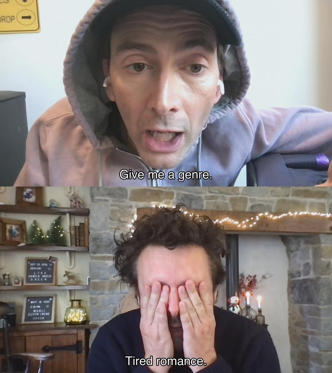 虽然在剧里被损的很惨,但Simon是个很厉害的编剧。Staged不仅是简单的特殊时期电视剧形式上的创新(Zoom拍摄和呈现方式的尝试,以及“戏中戏中戏中戏…”的结构,做得太棒了)。它始终以David和Michael两个人相处为线索,实际上是观察隔离中的我们自己:第一季剧的首要目的是“陪伴”,带着观众们一起适应突变的生活,捱过沉闷压抑的日子;第二季是一面“情绪的镜子”,我们观察两个主角的压抑、牢骚、争吵,也是在看我们如何和自己、和朋友家人的情绪相处;最后一季就是当所有外在的一切都“结束”了,要move on了,我们要怎么走出这段痛苦、封闭,但是逐渐麻木,甚至不得不承认已经适应的日子。最后一季中间几集我和主角一样感到tired,但是最后真的要说结束了我和David一样不愿意“应门”,害怕改变。