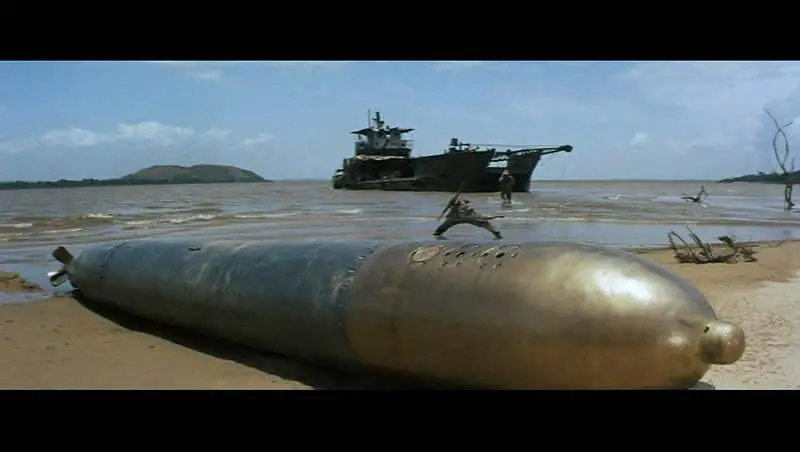 高射机关炮和机关枪齐射,钢板船体的驳船没咋的,除了更破烂;发射鱼雷,也不知是鱼雷速度太慢,还是驳船灵活,居然躲开了,鱼雷擦边而过,冲上河滩搁浅;劳伦斯艇长没招了,只好紧急下潜,企图逃之夭夭。看着潜艇下潜,晚了一步的墨菲懊悔不已,捶胸顿足之际突然发现不远处水面翻腾,冒出大量浑浊的水泡,原来德国潜艇慌不择路,一头扎进河底的泥沼里了。墨菲急忙指挥驳船开向不远处河滩,去取那枚搁浅的鱼雷,路易被墨菲的疯狂吓得退缩逃跑了,墨菲自己来干。