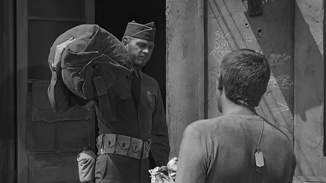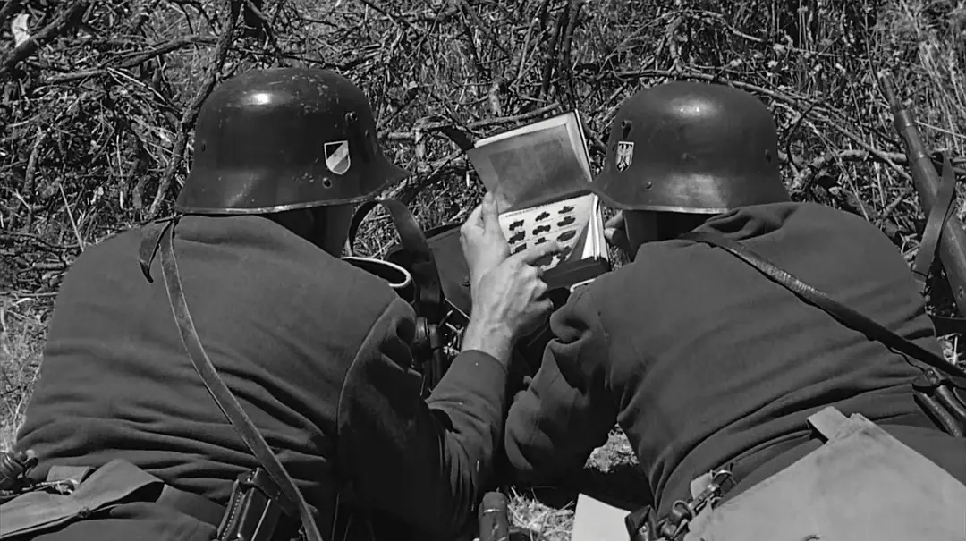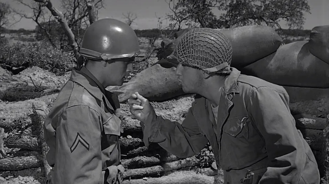 在挂完弹药盒子返回时,细心的克比发现多了一条电线直通他们的碉堡,顺藤摸瓜,在碉堡里发现了德军安置的窃听器。拉金决定将计就计,安排克比在碉堡里假装和指挥部通话来迷惑德军。来接替克比继续忽悠的唐申到底是司令部的人,见多识广,居然自称是负责娱乐的唐申上尉,谈到给美军士兵放电影来鼓舞士气的事,还谈到兵员已满,每个散兵坑里塞了五个兵,建议把多余的兵送到也在打仗的日本去,这牛皮吹得有点大,当即引来德军的炮弹回应。也不知道那个一心想参加美军的波兰人霍曼是咋来到前沿阵地找到他们的,这个波兰人很机灵,先是一瓶酒“贿赂”了里斯,接着又分给大家带来的鸡蛋和苹果酒,事已至此,拉金只好安排他暂时帮忙补充弹药。