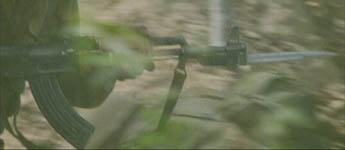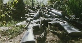 n 与北越人民解放军相比,越共H-15营的武器就比较杂,除了AK-47和SKS外还有MAT49冲锋枪和莫辛-纳甘步枪。MAT49是法国生产的,这种9mm冲锋枪是越盟在法国人手中缴获的,越战时期被越共游击队大量使用。莫辛-纳甘步枪不仅出现在H-15营的镜头中,在片头伏击法国第100机动团的镜头也有出现,另外在那一段情节中还出现了大量的二战武器,包括苏联的PPSh-41冲锋枪、PPS-43冲锋枪、捷克的ZB26轻机枪。n
