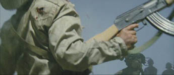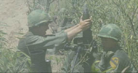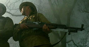 我给予这部影片很高评价的另一个原因是——战争场面的真实。片中几乎完全再现了1965年那一次交锋的历史(虽然可能为了电影的波澜起伏,有的镜头丧失了一点真实性)。摩尔营长确实如他自己在战前的演讲中那样“开战以后,我将是第一个走进战场、也是最后一个离开战场的人。我不会留下任何一个同胞,不管是已经牺牲的还是仍然活着的。我们所有的人将一起回家”。他确实做到了没丢下一个战友,无论生死。有人说,战争场面不太真实,不过我没看出来。我不是军事迷,对于各种战术和武器不了解,我个人觉得影片中的战争场面很真实。AK47、M16、M60、迫击炮、火箭筒、手榴弹、直升飞机、战斗机等,我没看出什么问题来。对了,有一点值得提,那就是北越士兵所用的手榴弹是我们中国造的棒锤形手榴弹。摩尔在书中说,他一眼就看出是中国造的。其实美国人也知道北越军队的背后是我们中国大陆在支持,但是美国出于各种考虑并没有公开这一点,可能是美国害怕我军直接参战吧。