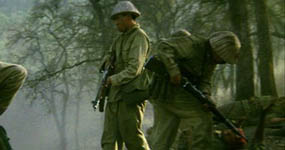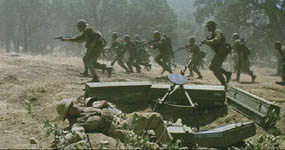 影片中表现了美军一种经典战例。一个排由于冒进被北越军队给包围了,切断了他们回到大部队的线路。由于越军人数占绝对优势,本质上讲所有在陆地上的空骑兵都处于越军的大包围圈中。但是就是这样没有任何物资援助的一个排,深处四周都是敌人的境况下,竟然能够坚持两天!这让我这个军事盲感到了吃惊。为了消灭靠近的敌人,被包围的排不得不要求美军的炮火在距离自己不到四十米的地方爆炸,单从这一点,可以看出美军炮火的精准度。电影中的战争镜头很多,很残酷,很恐怖,恰如一位曾经参加过二战的美国大兵所说的那样——战场就是人间地狱,我就不一一描述了。