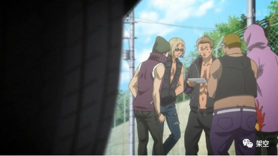 一辆车旁,站着五个面相不善、穿着粗野的男人。