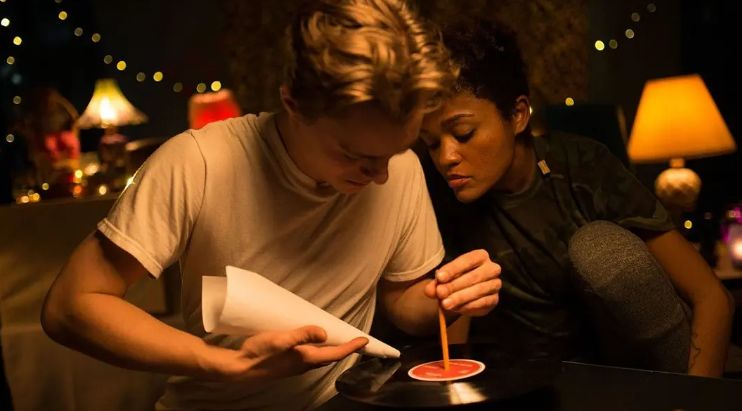 电影色彩好多地方都有情感暗示,比如维克和女孩制作手工唱片播放器,就是用了红色,很明显是情感升温寓意。之后电影开始引入黑白色,在残障人士的蹦迪聚会上出现,截止这里,导演彻底开始穿插意识流片段,闪烁的灯光,节奏强烈的电子乐……随后运用较大段的黑白摄影就是前往车站的车上,维克“拆穿”迪玛的时候和车站的混乱时刻,手持镜头的摇晃完美呈现了抗议现场紧张混乱的气氛。