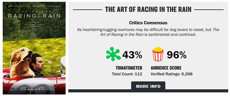 《我在雨中等你》目前豆瓣8.2分,IMDb7.5分,烂番茄观众好评率高达96%。虽然媒体口碑平平,但它无疑是去年口碑最好的动物题材电影。