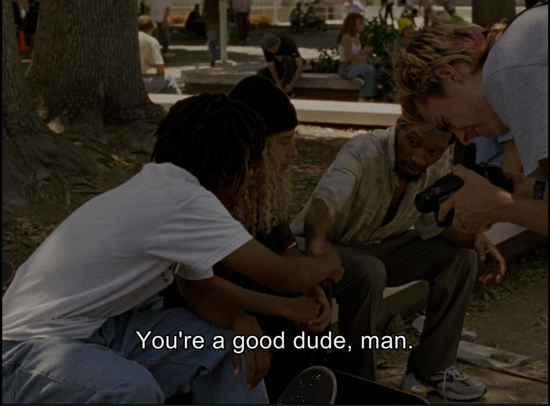 电影里最美的一个镜头是当警察开始赶skate park里面的人时,全部慢动作配以天使般的音乐(Philip Glass: A Normal Man Running),感觉这个犯法犯得很有美感,或许这就是导演所追求的自由吧。再有一个经典镜头就是当Ray为Sunburn对黑人的看法如何时,Sunburn来了一句:”What are black people?”一个是这个白人孩子确实不知道,另外一个意思暗指一个人的种族似乎不太重要,黑的白的他也看不出不同,这句也给这几个人的友谊奠定了些许基础。