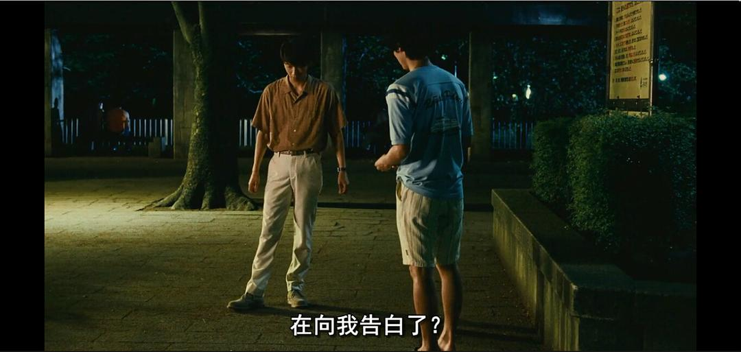 公园:最乐不可支n 世之介是因为认错人才认识加藤雄介的,并且赖上加藤雄介,各种蹭空调,求倾听他的“女性烦恼”。加藤雄介实在是对他很无可奈何。那个晚上,他说要去散步,其实是要去同性恋去的公园里找“伴侣”,没想到世之介毫不识趣地跟着。于是只好跟世之介坦白真相,没想到一根筋的世之介以为加藤雄介是要向他告白。这一幕实在是有够让人乐不可支。世之介搅和了加藤雄介的好事,还一副“我什么都没做”的模样,真是让人恨不得海扁他一顿。n 那个年代,同性恋身份大抵还是比较不被人接受的,加藤雄介在表明真相的时候,也说如果你觉得不舒服,可以不再见我。但是没想到的是世之介没有半点惊讶与多心,依然乐滋滋地将手中的西瓜分与加藤雄介。这种友情,是不带任何世俗偏见的。这大概也是加藤雄介怀念世之介的最大原因。