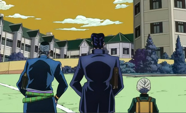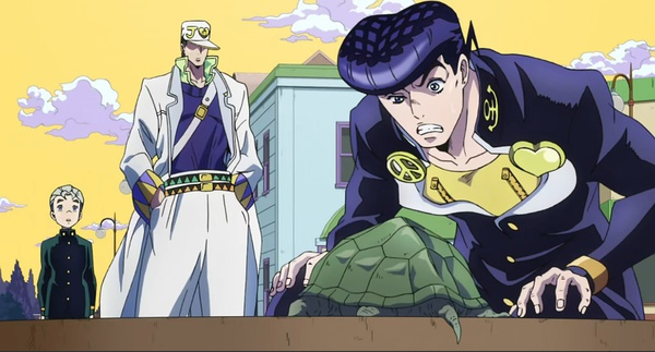 加藤说:色彩方面,大体借鉴荒木老师插画的上色风格,比如第4部漫画的封面页还有海报等。原先第3部里过于写实的画风这次也调整成偏漫画的画法。津田与主创团队意见大体一致,主要以原作第4部中后期的画风为参考处理画面。以至于明明是日本的风景,用色却十分另类,让人耳目一新的同时却也并不显突兀。