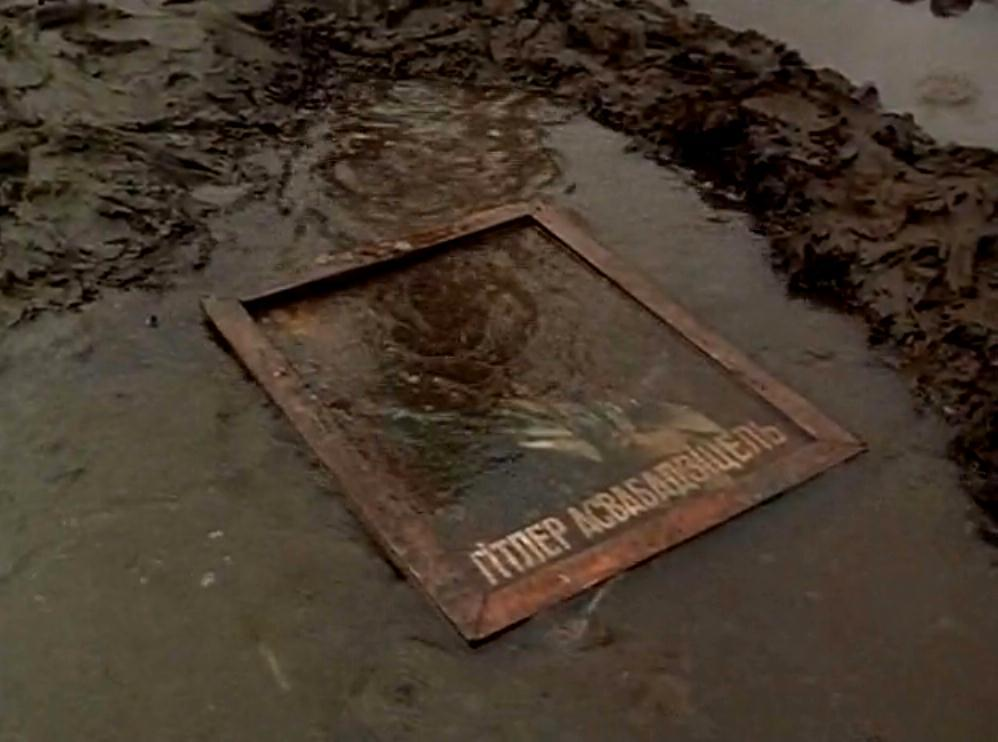 镶嵌在镜框里的希特勒大照片浸在水坑里。