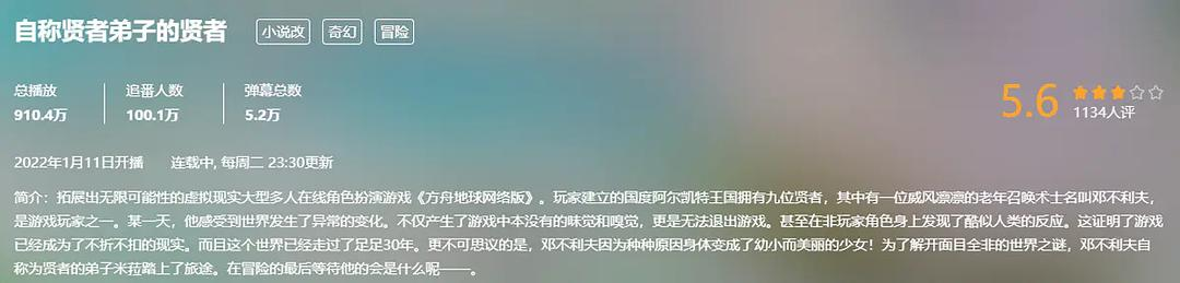 就连“叔叔”这边也只有900多万的播放,当然这900多万的播放其实十分的水的,毕竟现在“叔叔”都不买新番了,自然没有多少人看到好看的了,于是《自称贤者弟子的贤者》才有900多万的播放量吧,不然的话一定会十分低的。