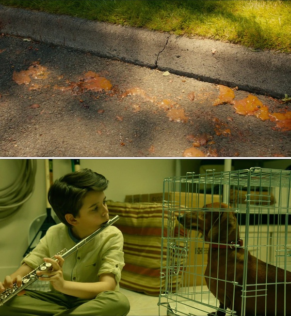 在“孤独男孩对生命的追问”中,腊肠狗的主题音乐是德彪西的《月光》,选用古典乐的点子正如它的启发者一样:《驴子巴尔塔扎尔》中驴子的主题音乐是舒伯特第20号钢琴奏鸣曲D959-第二乐章忧伤;另外两片相同的地方还在于结局动物主角的惨死。《月光》在第一部分反复出现:男孩与狗独自在家玩耍的慢镜头用了《月光》固然令人心旷神怡;之后恶趣味的索伦兹又用了1分多钟的抒情长镜头配《月光》,滑过路边狗拉了一地的稀屎……这个“又臭又长”的镜头让人觉得狗真可怜,同时又因其德彪西式飙稀、高雅与恶心的反向叠加产生了“月亮之上自由飞翔”的奇异笑果。在豆瓣短评中就有在影院观看的人写道:“德彪西的《月光》每次出现都是包袱,后排歪果仁差点笑出翔。”如此看来索伦兹的目的就算是达到了。而男孩的主题音乐也是长笛演奏的古典乐,长笛作为清冷家中另一个重要道具也多次出现在镜头中。