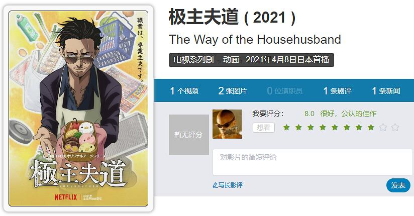 《极主夫道》只有5集,每集十几分钟,虽然豆瓣上评分不高,只有6.8分,不过,天天个人倒是十分喜爱这部特别的番。