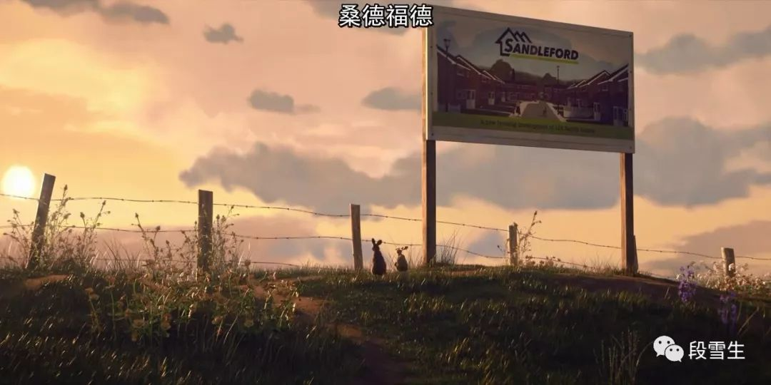 兄弟俩跑到了一个地方停了下来,这时全景交代了一下环境,我们看到了铁丝网将这一片拦截起来,旁边立着一块大牌子,写着“桑德福德”,原来这里是一块兔子生活环境的保护区。与小多子的梦境相互映照起来,看来这块本属于兔子的地盘马上要被人类侵占和破坏。