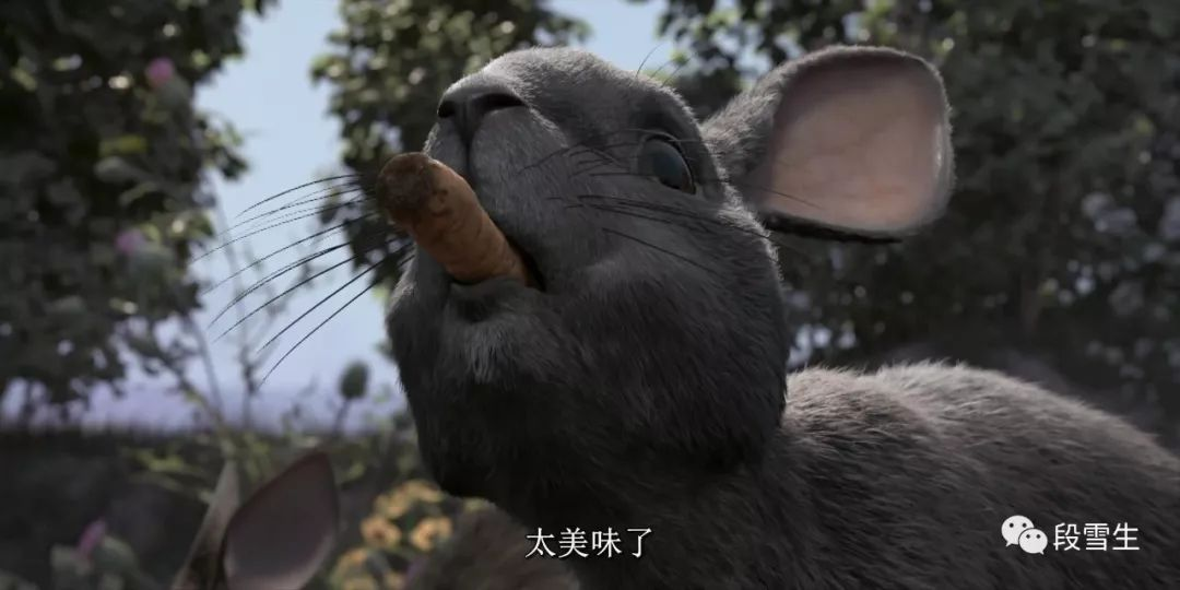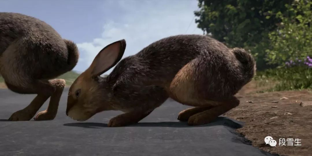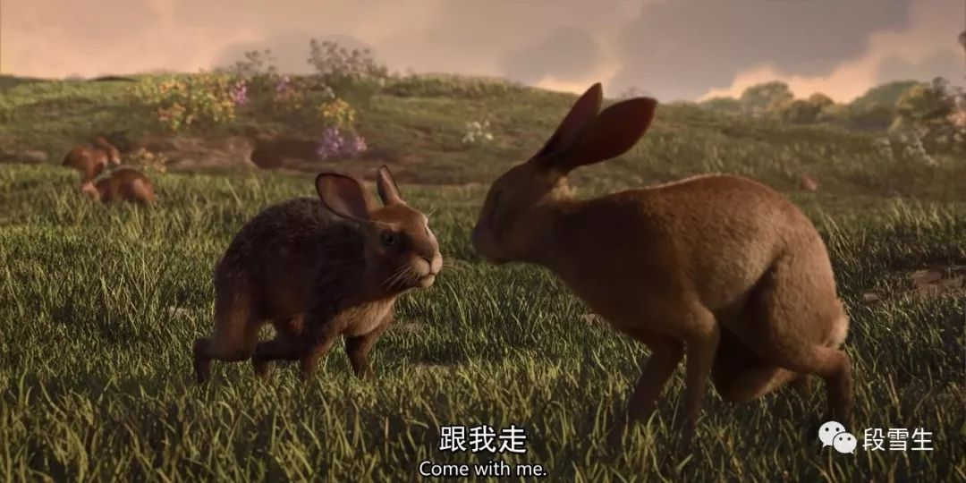 正片开始,在一片阳光明媚的草原上,镜头像无人机一样贴地飞行,穿过草地、溪流、鲜花,展现了一番兔族聚居地的美好风景。接着镜头追上了我们的第一男主角榛子,随着他的奔跑,镜头不断移动。