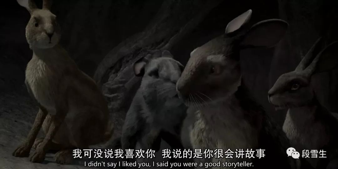 跑路的时候,兔子们穿过一片黑暗的森林,充满黑色幽默感的野风信子不停地讲地狱黑兔子的恐怖故事吓唬大伙儿,他作为说书兔的潜质展露出来。说书兔和预言兔一样,都是兔族中的身份和职业,负责口头整理现实中发生的兔族传奇故事,并将本族的历史传承下去。这就像是历史学家和民间说书人的结合。如果是在古希腊,他就是盲眼诗人荷马,吟诵兔族的《奥德赛》。