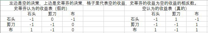 首先从史蒂芬的视角来分析。她认为的是假的收益表,因此按假的收益表分析。首先,空的策略剪刀是弱劣势策略,弱劣于布。因此如果空是理性人,他不会采用剪刀这个策略。因此可以将这个策略删去。