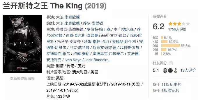 此外,导演没有刻意展现男主过人的军事才能——单挑靠匕首偷戳取胜(缺乏骑士风度),打仗靠手下人出谋划策——也是有目的的。片名是The King而非The King of Lancaster或者Henry V,说明导演是想表现一个普遍的统治者形象,而不是特殊的亨利五世。古往今来,决定统治者成功最重要的特质往往不是什么盖世武功或者过人才智,而是如何看人用人,这也是影片中最考验男主、最折磨男主的一点:是忠是奸,该听谁的?n 从历史角度来说,莎翁原著原本就是戏说(事实上亨利五世早年就参与政事,并没有浪子回头之说),导演对原著的解读更不可能是史实,但也谈不上亵渎。熟悉英国历史的人都知道,中世纪末期的金雀花家族国王王位更迭频繁,尤其是玫瑰战争期间,著名的国王制造者沃里克伯爵先后拥立约克和兰开斯特家族的人为王,这体现了在继承法混乱和不成熟的中世纪,王位的合法性难以保证,而英国自从《大宪章》和Simon de Montfort以来,靠着英格兰特有的议会和郡长制度,贵族权力得到了提升,所以亨利五世和其他一些金雀花国王极有可能受到了大贵族的操控(亨利五世的儿子亨利六世是被实锤架空了),而自己有时浑然不知。所以电影中国王被贵族玩弄于股掌的设定,从逻辑上是讲得通的。而历史上,开战的公认原因是当时阿尔马克人和勃艮第人之间的冲突。n 现在市面上到处是炒冷饭的翻拍作品,而本片作为“翻拍”,至少在制作上很有诚意(网飞爸爸就是能烧钱),导演也很有想法,真的不该这么低的分。n 如果真有人看的话,轻喷。