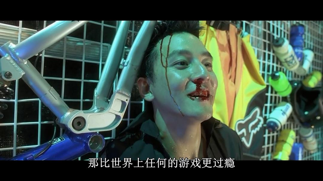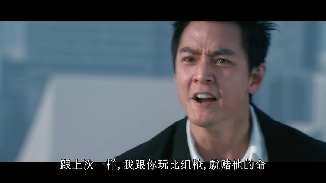 接下来是台词的功底。阿祖知道自己胜券在握,警方已经一败涂地了,那既然要摧毁警察,现在该怎么办,一枪打死他?那也太便宜他了。用酷刑慢慢折磨他?肉体的痛苦好像也不是那么的难以忍受。不过,警方不是最讲义气吗,那就让他承受心理上的内疚吧,让他的手下一个个死在他面前,而且最关键的一点在于,要让他知道这些手下都是因他而死。便说要跟他比试,因为阿祖知道,在如此多性命的重压下,成龙大哥是不可能赢的。请大家注意阿祖是如何说台词的。“我想跟你玩”,缓慢,没有明显的停顿,即事先想好了对策,此时一步步按计划走,平静、戏谑。“你好像是(停顿)警队(较长停顿)的射击冠军,是吗”,第一停顿表示对后面所说的头衔一种轻视,故意用“好像”表明了阿祖对此名头的不屑;在“警队”有一个较长的停顿,表示强调,因为他对警察恨之入骨,此警队的头衔更让他下定决定要羞辱其一番。