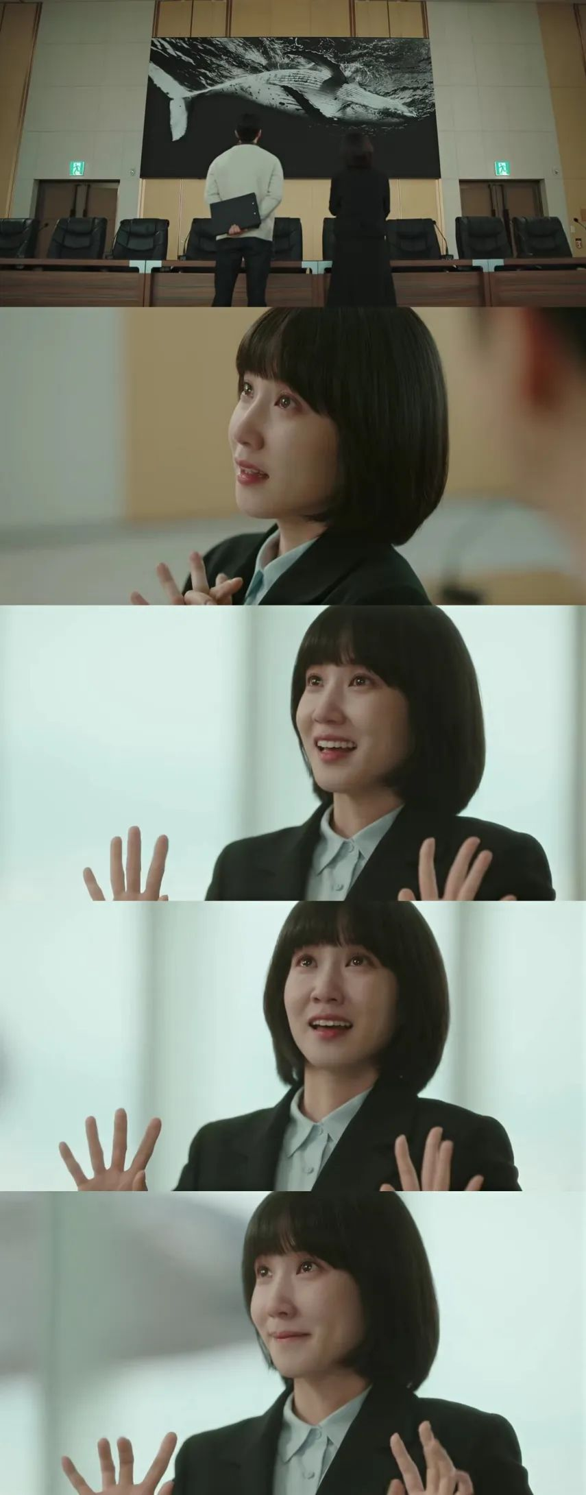 相比较一开始,英禑紧闭着眼睛、肩膀蜷缩、紧握双手、视线朝下方的局促模样。现在的英禑表情、肩膀和手指都舒展了许多,也能抬起头自然地平视前方,三脚、春三、福顺、江豚和虎鲸朋友出现了,小鲸鱼的上班路不再孤独。