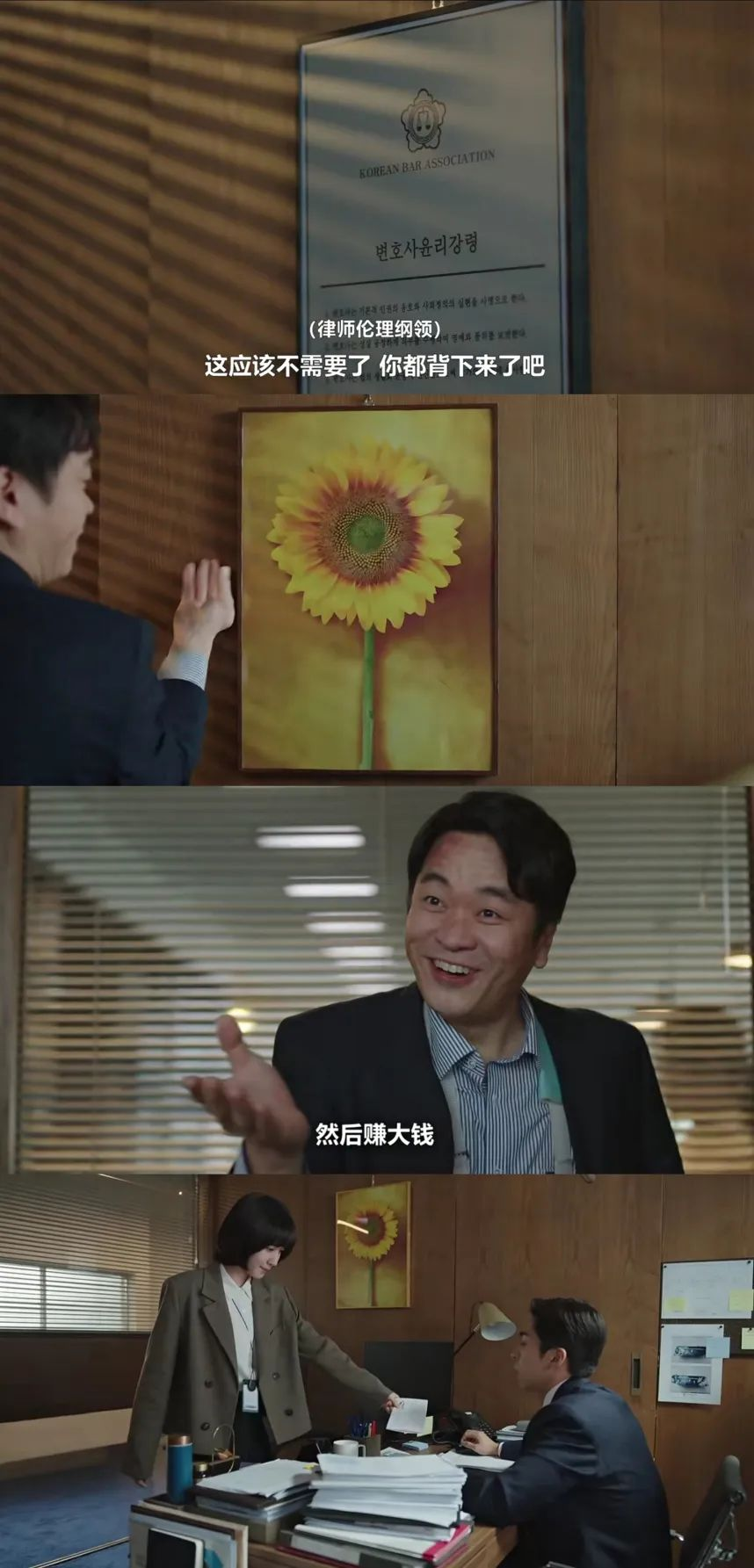 在宽松的郑明锡律师手下,权敏宇过得太舒服了,团队内搞搞小动作,郑律师也只是点拨一下。然而换了张胜准律师,和他们三人既不是一个团队、没有凝聚力,也难以沟通。遇见只会怪别人、只顾自己逃跑的那种上司,反而促进了三人的凝聚力,会有一种“我们是一起的”感觉,比起内部斗争,现在是该一致对外的时候。