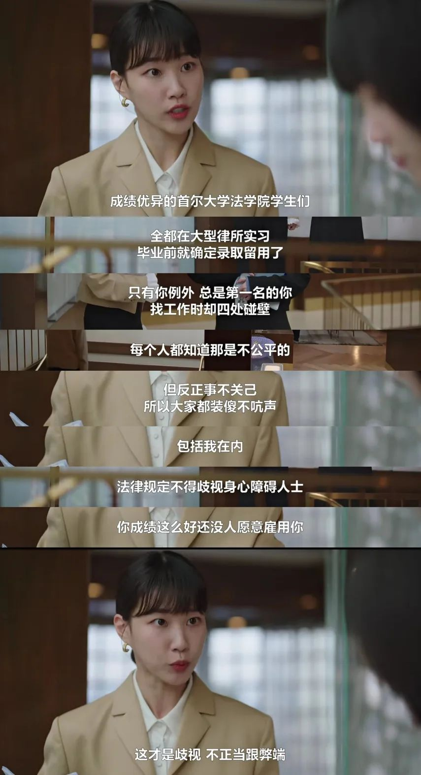第七八集讲的是同一个案子,关于征地。这个可能话题有点敏感,因为大拆大建的不止韩国。弱势的民众和强势的政府规划,补偿费不到位的情况下,民众要怎么办?以卵击石而已,大家理想化的想站在鸡蛋一边。这集有个细节,好朋友说让女主制造肢体接触看自己是否喜欢男主,但是大家反应是“未经他人允许不可以触碰他人。”这条律令不止保护妇女儿童,同样也保护着所有人,也同样约束所有人。崔秀妍问权明宇为什么针对禹英雨,是因为她不是强者么?权说禹英雨是强者。权明宇其实不是坏人,他是一部分普通人的代表,在对自己有利时追求绝对公平,比如觉得禹英雨走后门,在对自己不利时认为对方的弱理所当然的限制对方的发展,是对方能力不行,比如质疑禹英雨的自闭。其实禹英雨之所以无法通过正常渠道进来,正式因为这些人高高在上的歧视,后来她也证明了自己,能让竞争方老大亲自挖角。评论区可以看到很多这种逻辑的人都在破防,因为男性的歧视限制了女性的发展,反过来又指责女性弱小。有兴趣的可以读一下毛主席1919年发表的《女子自立问题》,他才是最伟大的女权主义者。这里跑题聊一下“丁真”这个现象,男人们讨厌丁真因为觉得他靠脸吃饭,什么都不会就靠着脸火起来不公平。但是这件事情长久以来都发生在女性身上,男人们的反应当时则是:“你们女人真容易,不会念书没关系,长的好看就行了。”在现在男人也被凝视的时候,才会明白这条路不是所有人都能走的。忽略丁真受限于教育条件的事实,忽略人家为当地旅游业做出的宣传和贡献,开始在意起了“绝对公平”。