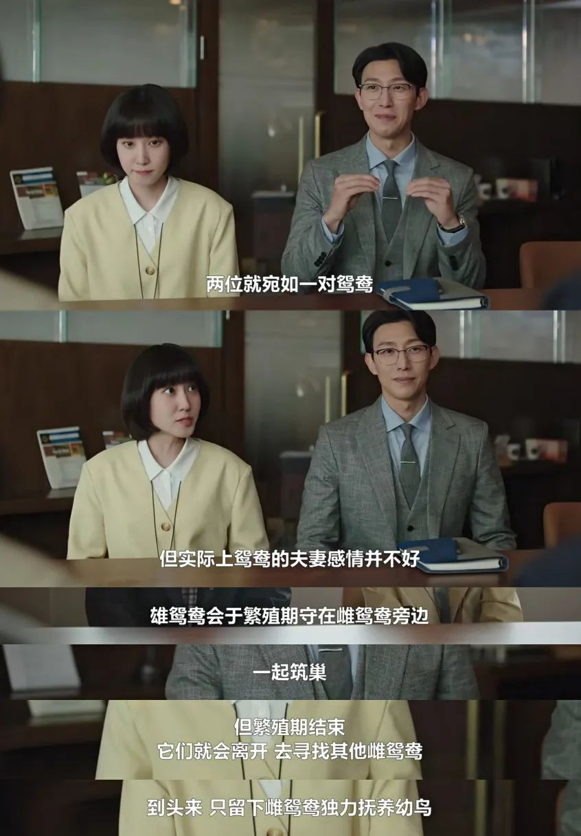 有人一直在说男女主没有cp感,更喜欢女主和上司。其实上司只是做到了上司的本分,另外给女主一些自己发挥的空间而已,因为上司不能理解女主对于鲸鱼的执念,并不是能完全接纳她,只是作为得力的下属看待。如果觉得他们有cp感的都是单纯慕强吧,因为上司是传统意义上的精英,是一般爱情剧里面男女主恋爱的模板,小可怜终于找到了强大的靠山。这其实是一种歧视,觉得女主必须是庇护下的幼鸟,笼里的金丝雀。如果是只看条件,为什么这里面的男主或者上司没有喜欢崔秀妍?家世好漂亮又聪明?男主在这里反而印证了剧组的理念,即弱者也能得到尊重,女主可以在他面前做自己,可以谈论鲸鱼,可以被尊重。上司也好,同事姐姐也好,他们都对女主很好,但是这个“好”是帮助她融入社会的,就是规定这个不可以,那个不可以,让女主带着枷锁舞蹈。只有男主是可以完全听她说话,不用枷锁的。男主的职业并不是律师而是辅助的讼务组,让很多人看不上,因为觉得还不如女主。但是在这段关系中,两个人是平等的,不因为工作职位的高低,不因为社交能力的高低而彼此嫌恶。这才是爱情本来的样子,我爱你,是因为你是你。如果因为地位爱上一个人,那地位坍塌是否就会不在?如果因为事业爱上一个人,失业了是否就会离你而去?女主也会有困惑,为什么男主不喜欢漂亮家世好的同事而喜欢自己,我想这就是答案吧,爱情不是条件的排列而已。