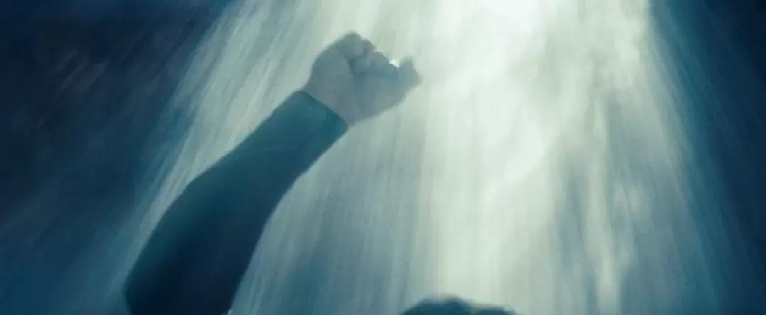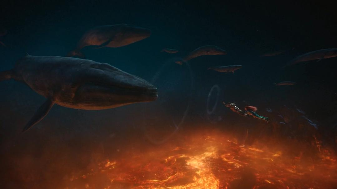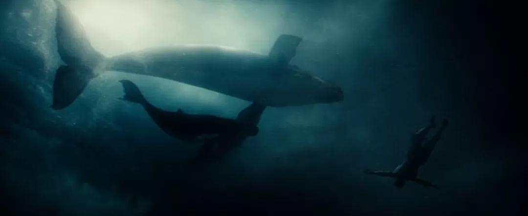 超人掉进海里后,我们可以看见他的身边有两条鲸鱼游过。