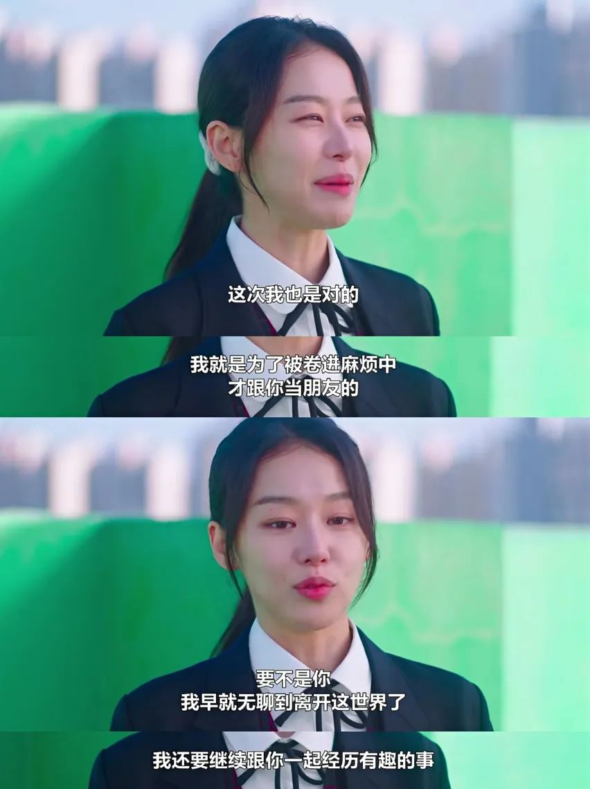 剧中好多次都在强调“有趣”——n- 睿智选择放弃击剑,因为“我感觉这项运动不再有趣”;n- 升琬面对哭唧唧的智雄:我就是为了卷进麻烦,才跟你做朋友的,要没意思的话,我早就离开这里了。n- 高中最后一次团体赛,宥琳和队友围成一圈:“最后一次比赛了,得有趣点,我们要乐在其中。”