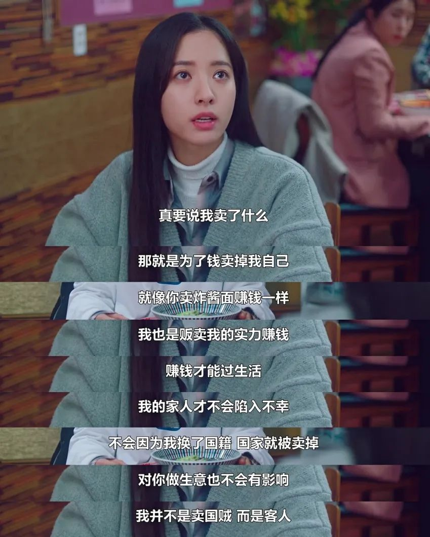 “请给我炸酱面。我出卖国家了么?那我们国家被卖掉了吗?真要说我卖了什么,那就是为了钱我卖掉了自己。钱对我来说很重要。就像你卖炸酱面赚钱一样,我也是贩卖我的实力赚钱,赚钱才能过生活。我必须挣钱,我家人才不会陷入不幸。不会因为我换国籍,国家就被卖掉,对你做生意也不会有影响,所以请你给我炸酱面。我并不卖国贼,而是顾客。”
