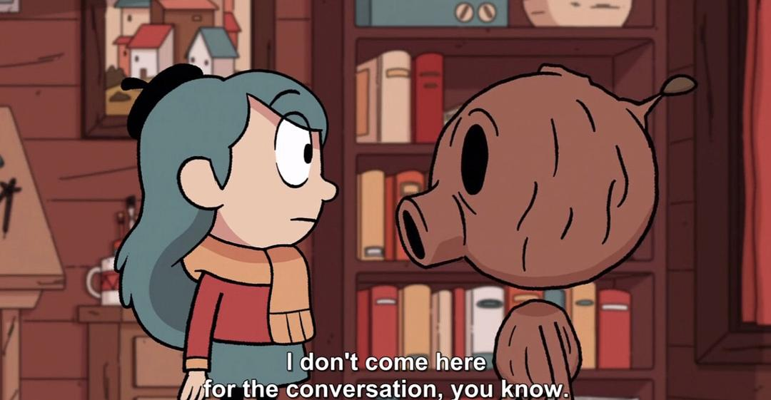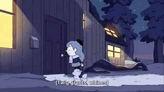 还有一次,希尔达遇见了守卫了地球千年的巨人,想帮他找到同伴,恰巧她发现木头人读过有关巨人的书,于是礼貌地询问又来家里蹭炉火的木头人知不知道关于巨人的事情。