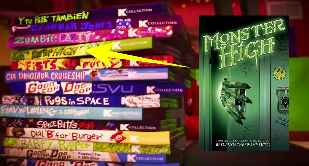墙的右上角第三张海报《Roboslayer 4》(翻译:机器人杀手4),我并没有找到对应的电影,但这部虚拟电影在Katie和同学们视频聊天吹水时被提起,还给其DVD封面特写镜头。网络主流观点是这部电影映射了本片中对抗机器人的设定,而有趣的是,Roboslayer 4的副标题为Rise of the brain exploders(翻译:爆脑者崛起),似乎映射Kaite家的巴哥犬,映射其短路了无数机器人大脑。