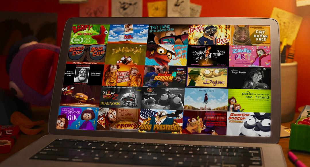 Katie坐在电脑前制作视频的镜头切换时,我们看到桌上摞的Katie完成的碟片越来越多。我们把转瞬即过的这一幕截图,发现碟片均标记为K系列(K collection),取自Katie的首字母。深挖一下,片名中的电影梗更是令人忍俊不禁。