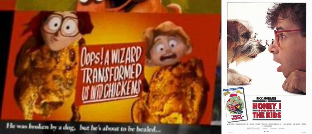 《Oops!A Wizard Transformed Us into Chickens》(翻译:哟一个巫师把我们变成了炸鸡),据推测来源为1989年的科幻喜剧《亲爱的,我把孩子缩小了》(Honey,I Shrunk the Kids),我个人持保留态度。