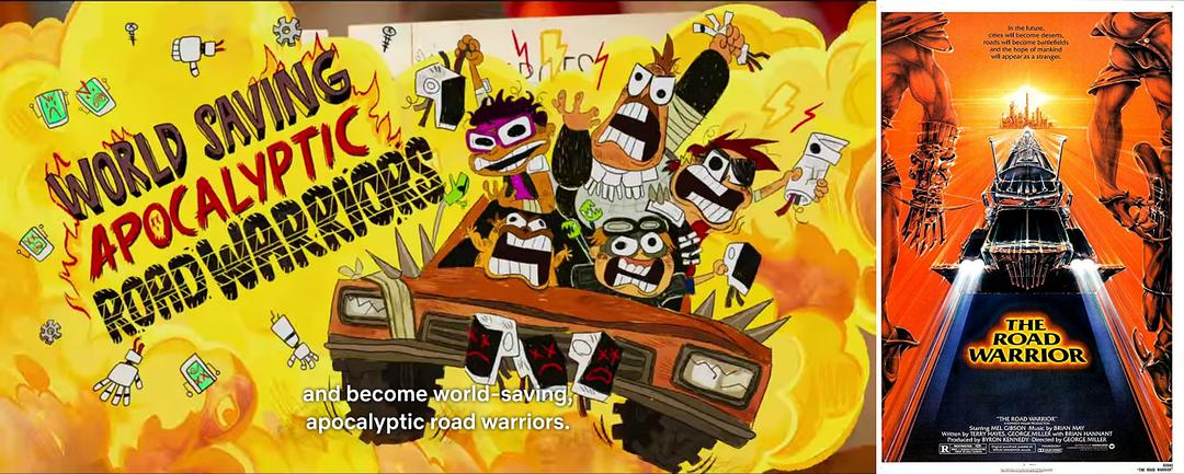 另外每次Katie描述作战计划,总会强行加入Mad max style,也就是乔治米勒《疯狂麦克斯》那样的黄沙漫天,引擎轰鸣,钉子皮靴机关头,金属摇滚Live。Katie自称的Road Warriors便是《疯狂麦克斯2》的副标题。