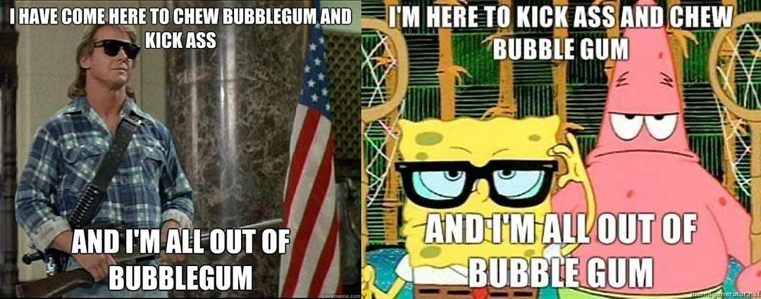 《极度空间》中的原台词为I have come here to chew bubblegum and kick ass... And I'm all out of bubblegum。 (翻译:我来这儿是要嚼泡泡糖和揍人发威了。。。何况我没泡泡糖了。)作为名台词,引用这句话的meme不少。